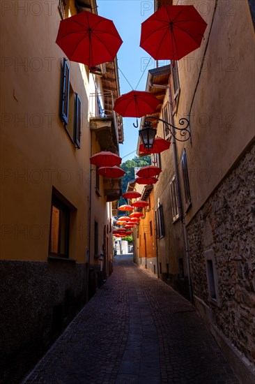 City Street in Porto Ceresio with Hanging Umbrellas in a Sunny Summer Day in Porto Ceresio, Lombardy, Italy, Europe