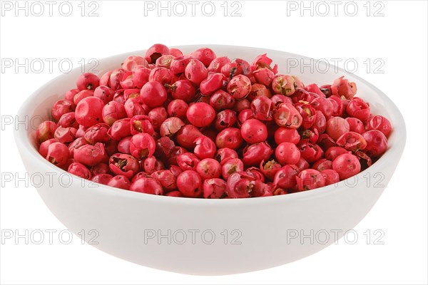 Fragrant pink pepper seeds in a white ceramic bowl isolated on white background