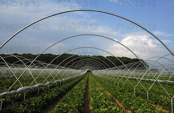 Strawberry plantations with tent poles, Chilcote, South Derbyshire, England, Great Britain