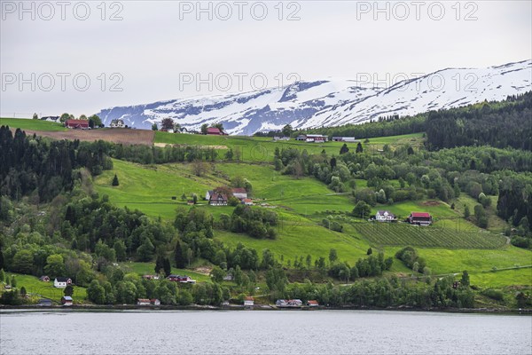 Mountains and Fjord over Norwegian Village, Olden, Innvikfjorden, Norway, Europe