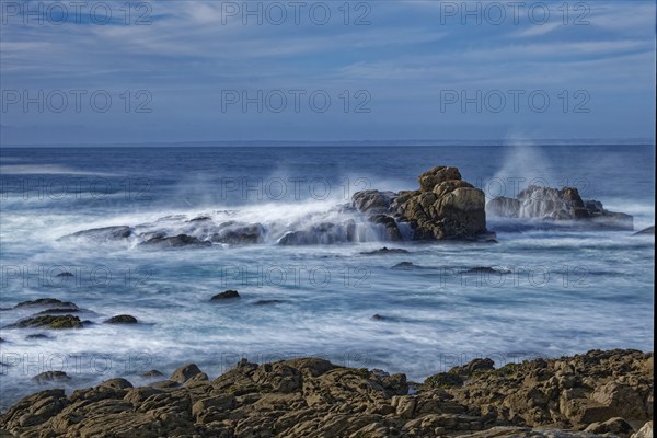 The waves of the Atlantic wash over the rocks on the coast off Penmarch in Brittany. Finistere, France, Europe