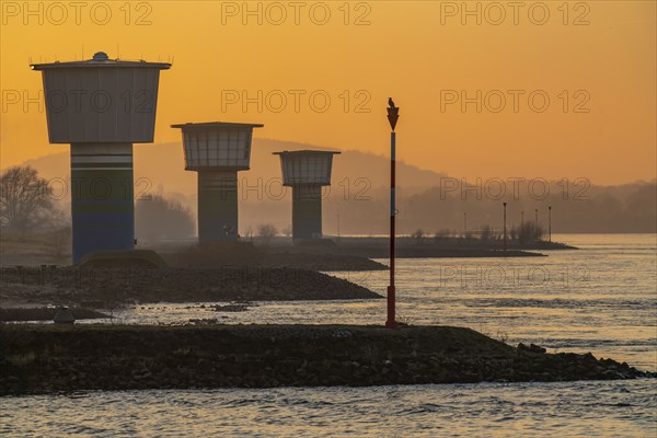 Rhine at Duisburg-Bruckhausen, towers of the water extraction facilities of ThyssenKrupp Steel steelworks, Winter, Duisburg, North Rhine-Westphalia, Germany, Europe