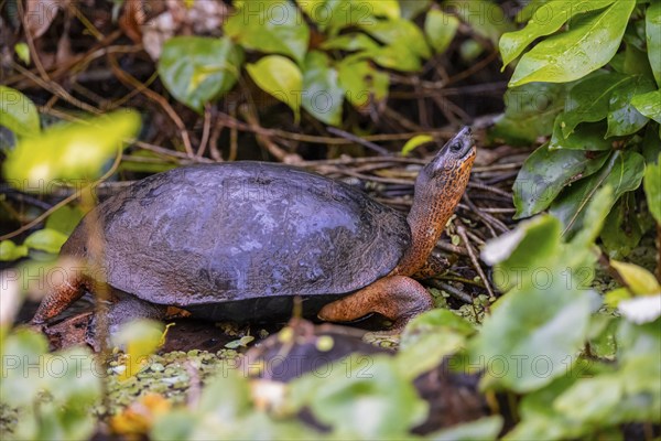 American tortoise (Rhinoclemmys funerea) among aquatic plants, Tortuguero National Park, Costa Rica, Central America