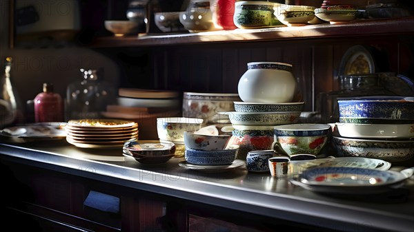 pile piles Heap Heaps deserted no one No People nobody uninhabited empty tableware crockery tablewares dishes kitchen kitchens Ai generated Ai generated art ai generative Ai generates generative AI Ai generiert Ki generated Generated AI KI generates generated with AI generated with KI Artifical Intelligence generated Kitchen scene
