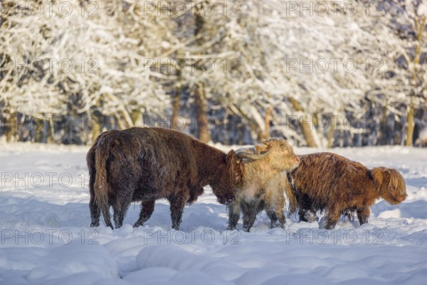 A highland cow (Bos primigenius taurus) and two calves stand at the edge of a forest on a snow-covered pasture. The cow cuddles one calf
