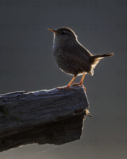 Wren (Troglodytes troglodytes) Snow king, blue hour, singing, mating, third smallest bird in Europe, territorial song, Middle Elbe Biosphere Reserve, Saxony-Anhalt, Germany, Europe