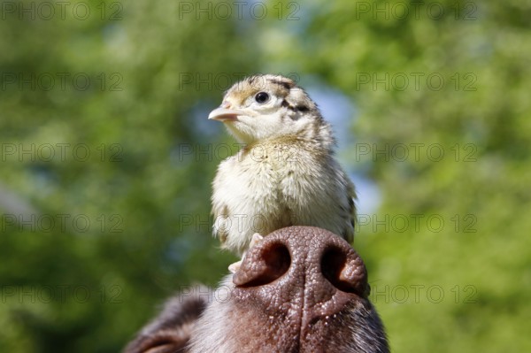 Lesser Munsterlander and Hunting Pheasant (Phasianus colchicus), chick, on nose, Lesser Munsterlander, Pheasant chick