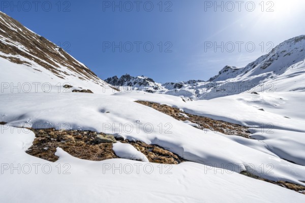 Mountain landscape with snow, ascent to Grialetsch Scharte, Grisons Haute Route, Albula Alps, Rhaetian Alps, Grisons, Switzerland, Europe