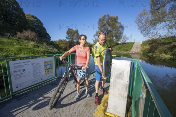 Cyclist, cycle tour, manually operated ferry across the Lippe near Halten am See, on the Römer-Lippe-Route cycle path, North Rhine-Westphalia, Hohe Mark Westmünsterland nature park Park