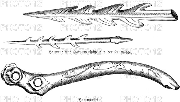 Objects from the prehistoric Kent's Cavern, the Kent Caves in Torquay, County Devon, two barbed harpoons and a hammerstone with two eyelets and decorations, palaeontology, archaeology, history of mankind, England, historical illustration1880