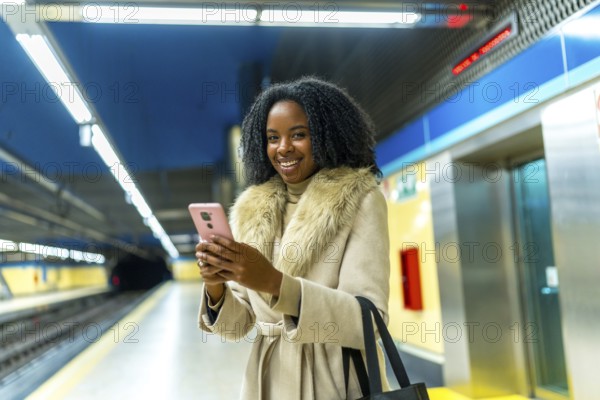 Smiling businesswoman using her mobile phone while waiting for the subway train at the station, embodying modern urban lifestyle and connectivity