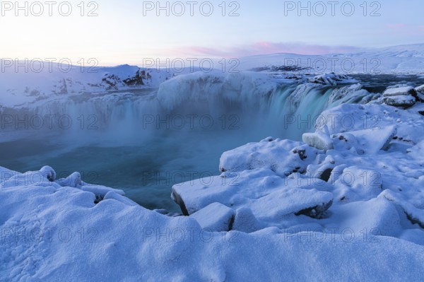 Icefall at the edge of the Godafoss waterfall at dawn, snow-covered landscape, Northern Iceland Eyestra, Iceland, Europe