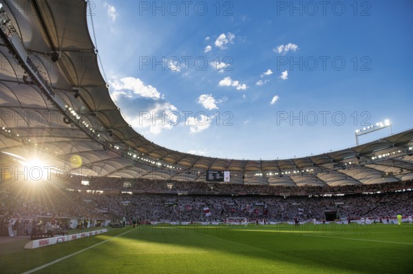 Long shot, overview, main stand, Cannstatter Kurve, evening sun, evening, atmospheric, flooded with light, stadium roof, sky, blue, MHPArena, MHP Arena Stuttgart, Baden-Württemberg, Germany, Europe