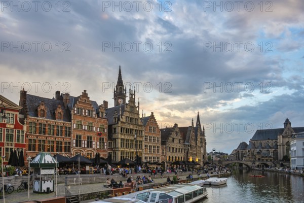 Ghent Belgium, city skyline at St Michael's Bridge (Sint-Michielsbrug) with Leie River and Korenlei