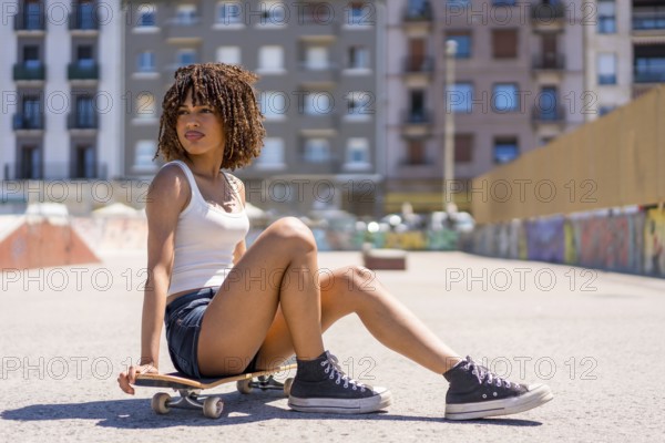Stylish young woman taking a break, sitting on her skateboard in a skate park, enjoying the urban environment