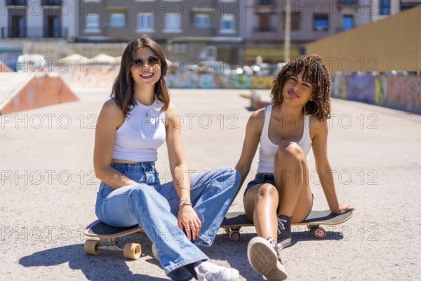 Two young women are sitting on their skateboards in a skate park, enjoying a break and smiling