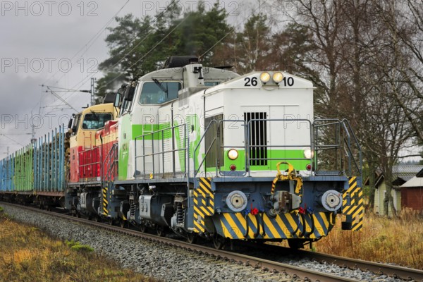 VR freight train with two diesel locomotives, Dv12 No. 2610 in the front pulling carriages full of wood logs. Humppila, Finland. October 30, 2020