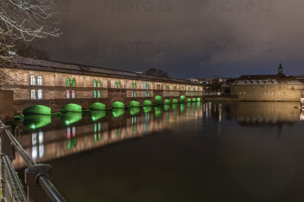 The Vauban dam illuminated at night during Christmas. Strasbourg. Bas-Rhin, Alsace, Grand Est, France, Europe