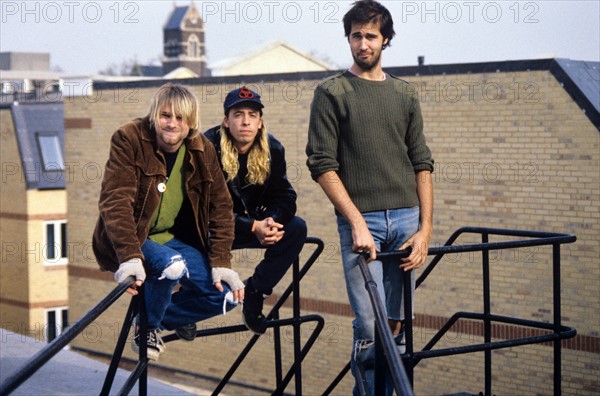 The American grunge band Nirvana, Kurt Cobain, Aaron Burckhard and Krist Novoselic (l-r), on the roof of the Hammersmith Odeon in London on 22nd October 1990.