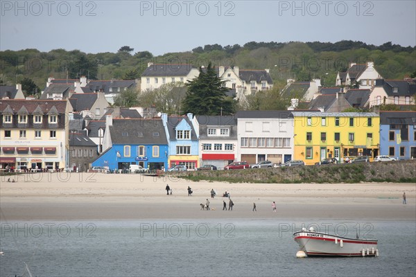 France, Bretagne, Finistere, presqu'ile de crozon, morgat, plage de morgat, maisons aux facades colorees, sable, maree basse, petit bateau,