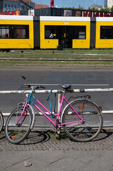 Allemagne (Germany), Berlin, Friedrichshain, immeuble, ancien Berlin Est, arret de tramway, rue, velo,