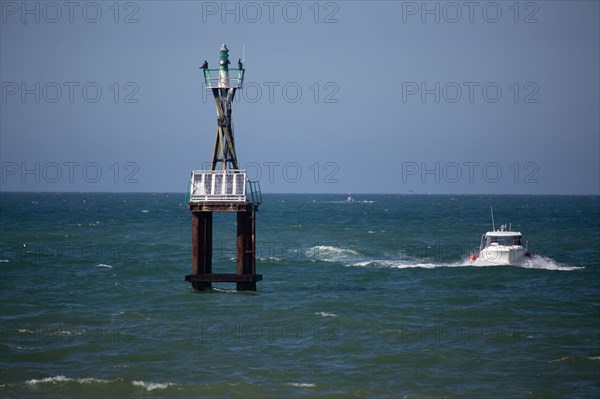 France, Région Normandie, Calvados, Côte de Nacre, Courseulles-sur-Mer, vedette de plaisance, embouchure de la Seulles,