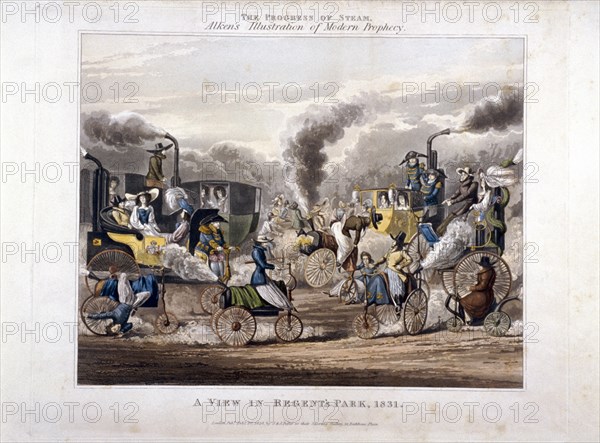 Regent's Park, Marylebone, London, 1828; scene with people driving various steam powered vehicles in Regent's Park.