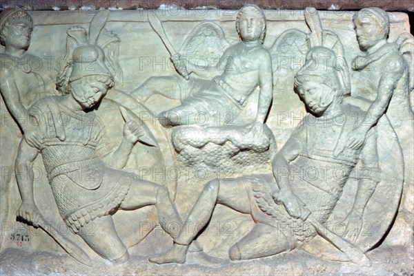 Detail of an Etruscan sarcophagus from Chiusi showing the death of Eteocles and Polynices. Artist: Unknown