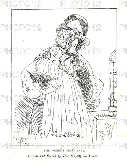 Earliest picture known of Victoria's first daughter, then the Princess Royal, age 3 months, with her Artist: Queen Victoria