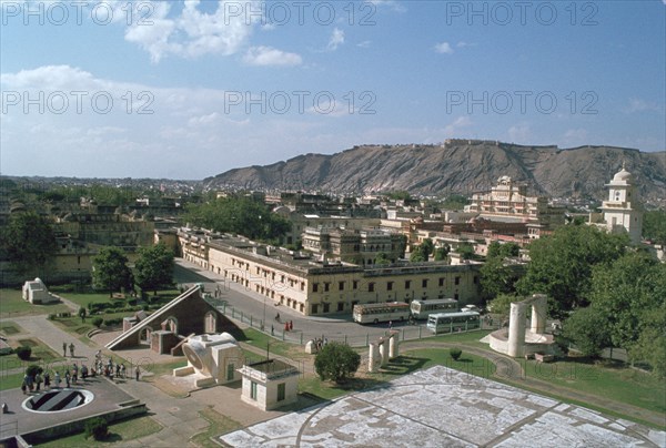 City Palace, Jaipur, Rajasthan, India. The City Palace complex in Jaipur was begun by the Maharaja Jai Singh II in the first half of the 18th century. His successors added further buildings. In the foreground is the Jantar Mantar (Yantra Mandir), a collection of architectural astronomical instruments built by Jai Singh II between 1727 and 1733.