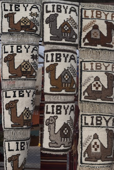 Carpet souvenirs depicting camels at the UNESCO Heritage Site of Sabratha, Libya, Oct 2007.