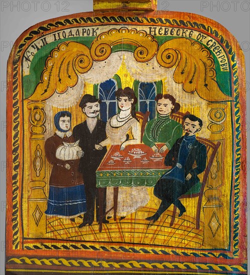 Mother-in-law's wedding gift to the bride. (Painting of a spinning wheel), 1920s. Found in the collection ofState History Museum, Moscow.