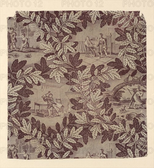 Fables of La Fontaine (Furnishing Fabric), Rouen, c. 1830. Foliage with scenes from the Fables of Jean de La Fontaine: 'Le Villageois et le Serpent', villager attacking a snake with an axe; 'Le Chêne et le Roseau', an oak tree representing the French king Louis XIV, and a reed which represent the people of France; 'Le Savetier et le Financier'; The Cobbler and the Financier. Designed by Alexandre Buquet after Jean Michel Moreau, the Younger, manufactured by Bapaume et Cocatrix.