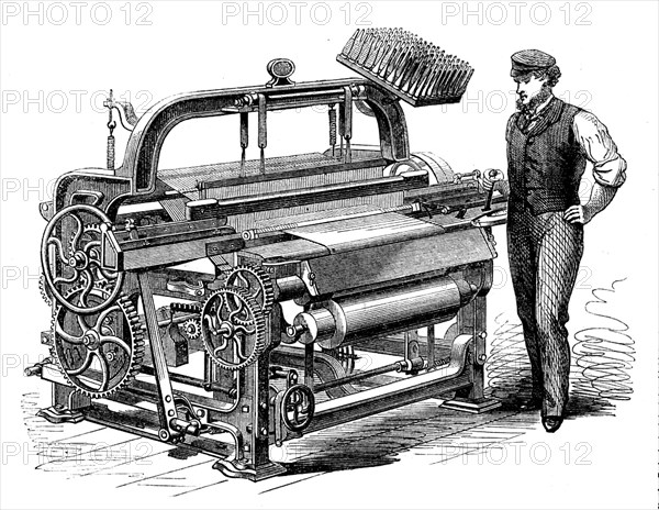 The International Exhibition: Messrs. Harrison and Son's power-loom for weaving flax, 1862. 'This loom combines many important improvements. It is supplied with a self-acting positive letting-off motion, which delivers the warp as required by the taking-up motion for the cloth, which motion is also positive. These two motions work in concert, and with such precision that the warp is delivered from the yarnbeam with the same regularity when the beam is almost empty as when it is full. The taking- up roller of this loom is covered with a patented description of surfacing material instead of that in ordinary use, made of emery. It is also supplied with the weft-stopping motion and other important appliances...the cranks are made of one piece of iron, bent by a graduated pressure being applied to them, the fibre of which thus remains undisturbed, and renders the cranks much stronger than when welded;...the bend of the crank - generally its weakest part - by the adoption of this plan becomes equal in strength to any other. A loom of this description is capable of weaving upwards of 180 yards of linen per week. One man looks after two looms'. From "Illustrated London News", 1862.