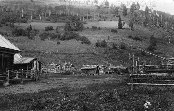 Farm Structures in the Ulus Kumys and a Ploughed Field on the Slope, 1913. From a collection of 109 photographs taken during a 1913 topographic expedition to the Gornaia Shoria in the Altai region and another topographic expedition to the Mrasskii region, Kuznetskii District (central part of the Gornaia Shoria). The photographs reflect both expedition activities and the life of the people in this region. Altai State Regional Studies Museum