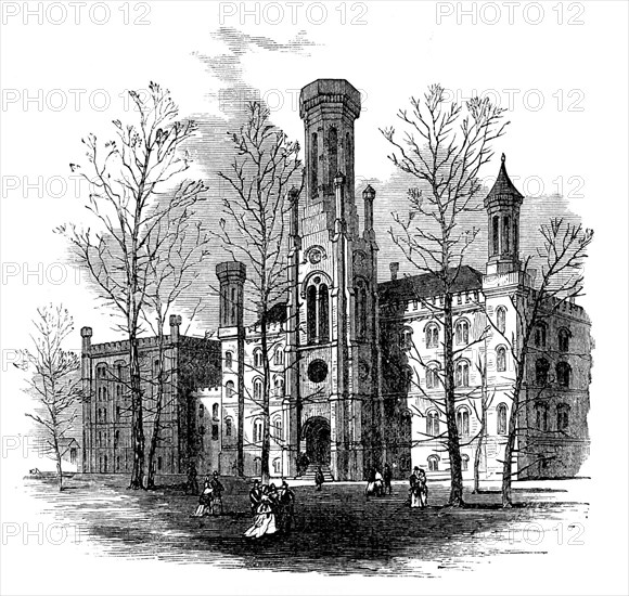 The Great Fire at Chicago: the University, 1871. The Old University of Chicago before the fire. 'The fire which destroyed, last week, the best part of one of the greatest commercial cities in the world is still the most engrossing topic of news. Telegraphic reports by the Atlantic submarine cable inform us of the extent of this disaster; but we must wait a few days yet for a complete description and narrative. In the meantime, it is convenient to look at the state of Chicago as it was before the fire; and the Illustrations engraved for this Number of our Journal will be viewed with a melancholy interest, as representing what has perished, though affording wonderful proofs of the energy and resources of Western America...Chicago, which began its existence as a town but forty years ago, on the swampy, south-western shore of Lake Michigan, contained, till the fire, a population of 300,000 souls. It had the largest export trade in grain and other provisions, and was the most bustling place of mercantile activity in the whole continent...It is reckoned that 70,000 people are deprived of the shelter of their homes. At least 250 lives were lost in the fire. Several plunderers were seized and hanged'. From "Illustrated London News", 1871.