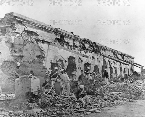 Indian Mutiny, 1857-58. Aftermath of the Siege of Cawnpore. Soldiers of the 1st Madras Fusiliers seated amongst the remains of the British entrenchment defences to barracks at Cawnpore which General Sir Hugh Massy Wheeler surrendered in June 1857. Cawnpore was the British military headquarters for the District of Oudh. The massacre of British women and children which took place there was one of the worst atrocities of the Mutiny.