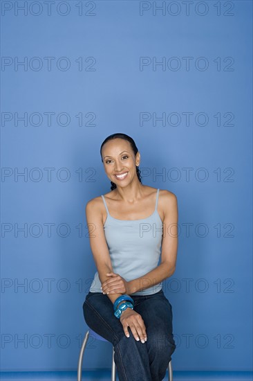 Portrait of happy mid adult african woman sitting on chair. Photo : Rob Lewine