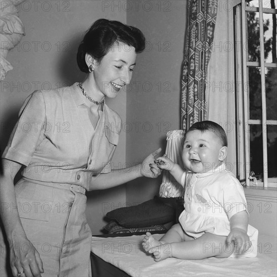Playing with Tubby Block's baby. Interior shot of a smiling woman holding hands with Tubby Block's baby. Kenya, 30 August 1954. Kenya, Eastern Africa, Africa.