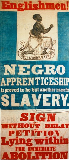 English anti-slavery banner. A framed fabric banner depicts a kneeling woman, enslaved under the system of apprenticeship. The bold text accompanying the image reads: 'Englishmen Negro Apprenticeship is proved to be but another name for Slavery. Sign without delay the Petition lying within for Immediate Aboliton'. England, circa 1835. England (United Kingdom), Western Europe, Europe .