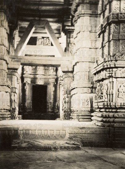 Interior of Sas-bahu Temple at Gwalior. Interior view of the larger Sas-bahu Temple, located within the Gwalior Fort complex. Completed in 1093AD, the pillars, lintels and steps are decorated with elaborately detailed sculptures and carvings of figures, flowers and patterns. Gwalior, Central Provinces and Berar (Madhya Pradesh), India, circa 1927. Gwalior, Madhya Pradesh, India, Southern Asia, Asia.