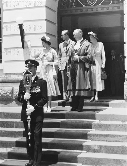 The royal couple leave Nairobi City Hall. The Mayor and Mayoress of Nairobi accompany Princess Elizabeth and the Duke of Edinburgh along a red carpet as they leave City Hall. A uniformed official bearing a ceremonial staff precedes them. Nairobi, Kenya, February 1952. Nairobi, Nairobi Area, Kenya, Eastern Africa, Africa.