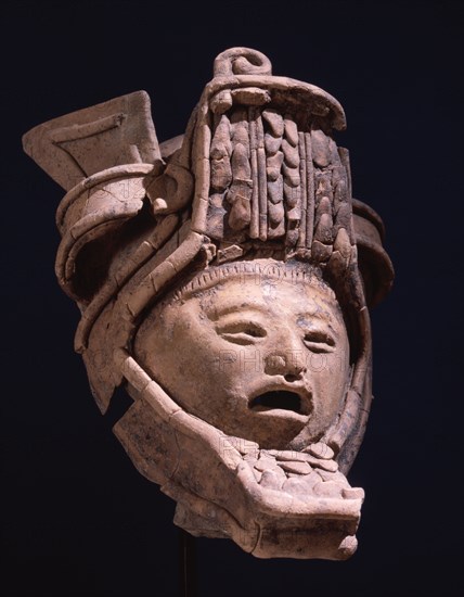 Pottery figurine with elaborate headdress, Mexico. Veracruz. Classic period 300 1200 AD.