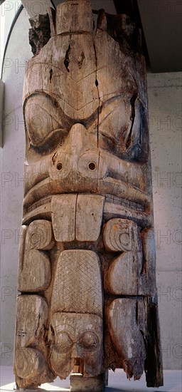 Frontal house post carved with a beaver which can be identified by its prominent teeth and scaly cross hatched tail, House posts such as these supported massive horizontal roof beams and formed the basic frame of the ceremonial house. Northwest Coast of America. Haida. Ninstints Village.