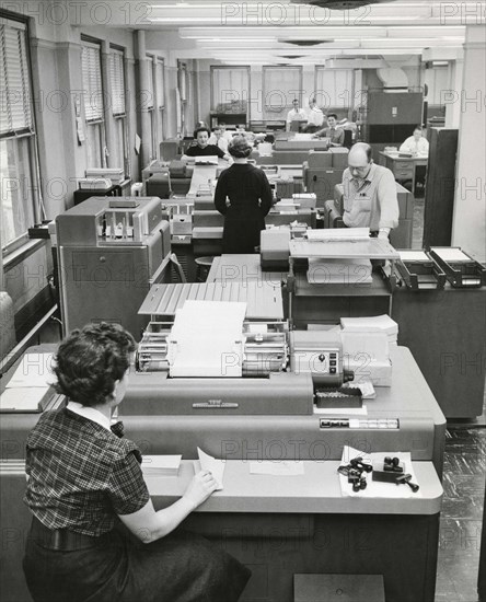 Office workers entering data with tabulating machines and punch cards at the Erie Railroad Company offices.