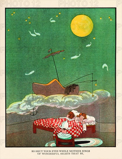 Two children rest in bed while their mother sings and the boat rests on a cloud waiting to take the kids to dream land.