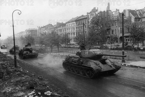 Soviet t-34 tanks on a street in berlin, may 1945, world war 2, fall of nazi germany.