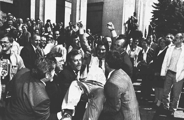 Ukrainian people celebrating at the ukrainian parliament building on the occasion of the approval by the supreme soviet a new ukrainian constitution on june 28, 1996, kiev, ukraine.