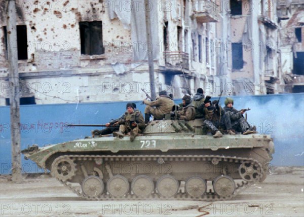 A situation in the capital of chechnya remains rather tense because the separatists continue a 'snaper war' here, picture shows a n armoured vehicle of the federal forces in a street of grozny, on monday, march 12, 1996.