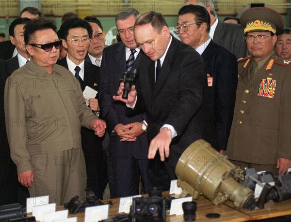 Novosibirsk, russia, august 11, 2001, director general of the novosibirsk instrument-building plant yuri metelsky (c) pictured demonstrating the production of his plant - some infra-red night vision devices to the north korean leader kim jong il (l) who arrived in novosibirsk on saturday.